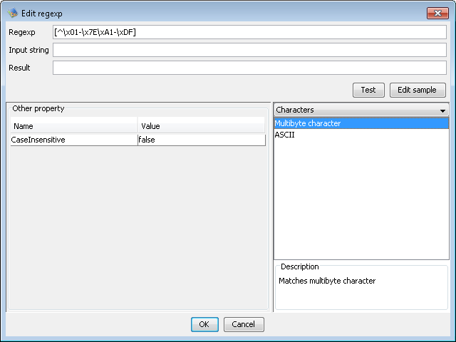 When double-click the regular expression functions, the Regular Expression Dialog is displayed. You can configure the properties and test the regular expressions.