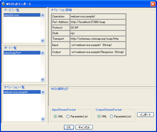 WSDLのインポートダイアログボックスでは、各リストから選択して「OK」をクリックすると自動的にインスペクタのサービス名 、ポート 、メソッド名 、SOAPヘッダー(送信) 、SOAPヘッダー(受信) が設定されます。また、ストリームペインの入力タブと出力タブのフィールドが自動的に定義されます。