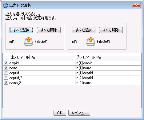 「出力列の選択」ダイアログボックスでは、入力ストリーム1、入力ストリーム2のフィールドがそれぞれin[1].フィールド名、in[2].フィールド名の形式で一覧表示されます。一覧で、出力したいフィールドのチェックボックスをオンにして「OK」ボタンをクリックすると取得対象になり、出力フィールド プロパティに表示されます。