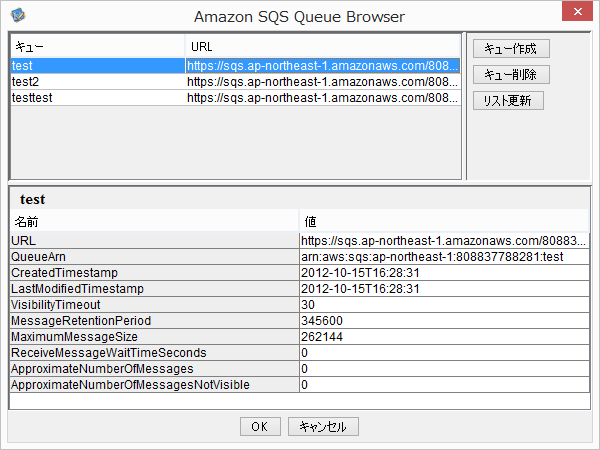 この画面ではキューURL とキューの新規作成と削除を行うことができます。