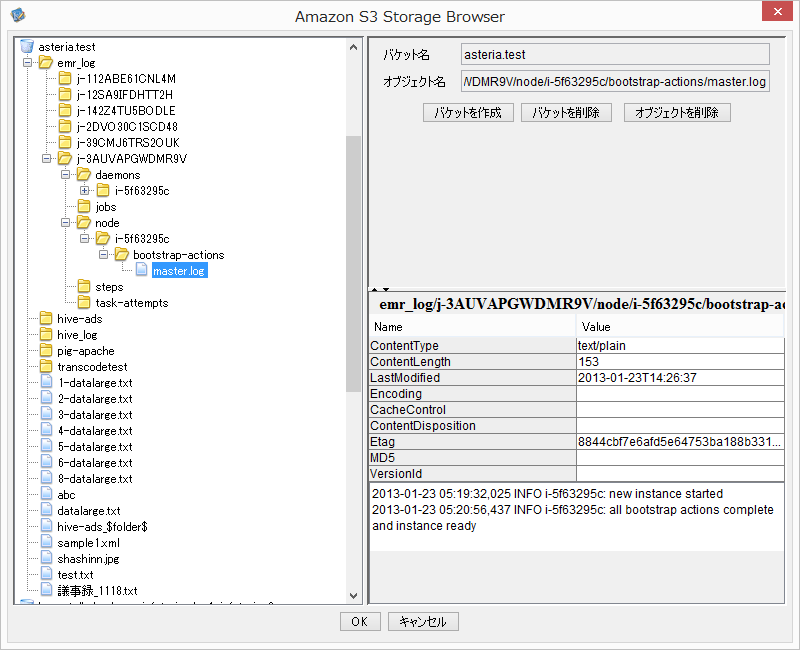 この画面ではバケット名 とオブジェクト名 の設定とバケットの新規作成、そしてバケットとオブジェクトの削除を行うことができます。