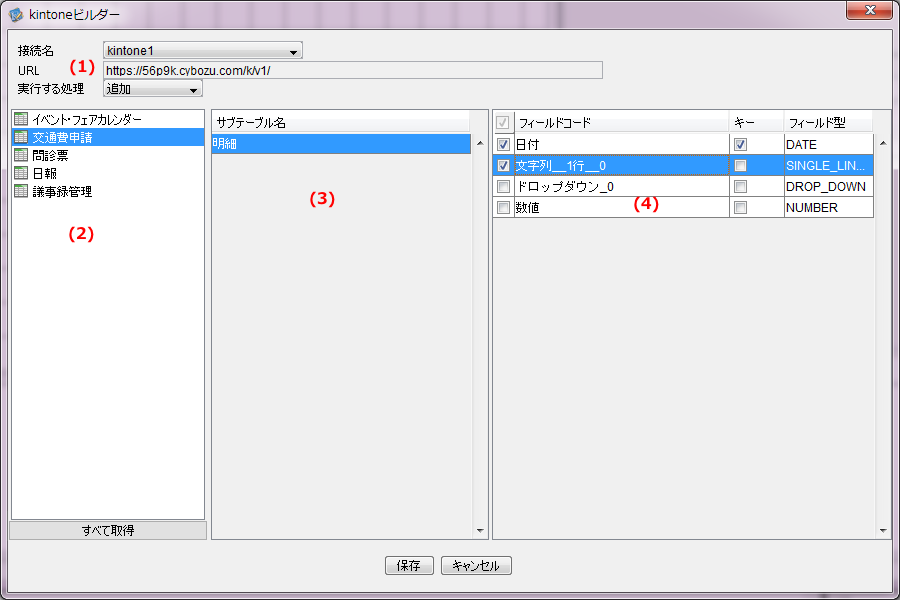 (2)のアプリ一覧からアプリを選択すると(3)に選択したアプリのサブテーブル一覧が表示されます。 (3)のサブテーブル一覧からサブテーブルを選択すると(4)に選択したサブテーブルのフィールド一覧が表示されます。 フィールド一覧でフィールド名の左にあるチェックボックスをオンにします。指定したフィールドを取り消すには、チェックボックスをオフにします。