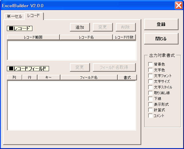 ワークシート上の指定範囲からフィールド名となる文字列を一括して取得します。「フィールド名取得」ボタンをクリックすると、範囲指定のダイアログが表示されるので、フィールド名を含むセル領域を指定します。指定する領域は、1レコードあたり列数・行数に一致した大きさでなければなりません。デフォルトでは、レコード領域のすぐ上側の領域が選択されて表示されます。
