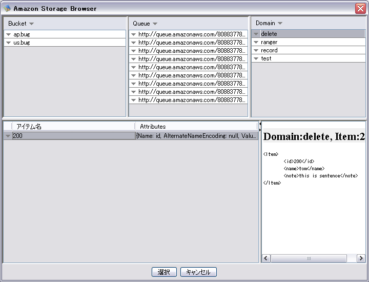 Bucket, Queue, Domain一覧選択行の内容を一覧表示します。