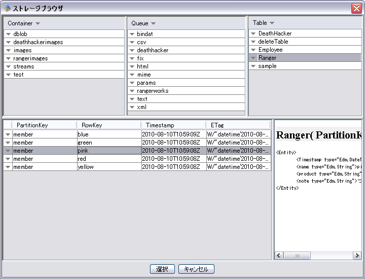 コンテナ、キュー、テーブル一覧選択行の内容を一覧表示します。
