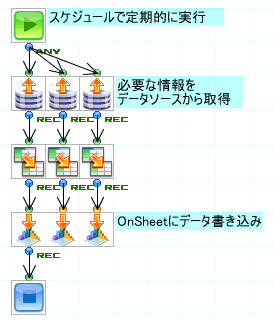 このパターンの処理をフローで行う場合、スケジュールで定期的に取得したデータをOnSheetに書き込むだけの単純なフローで実現することができます。