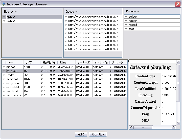 Bucket, Queue, Domain一覧選択行の内容を一覧表示します。
