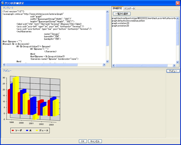 詳細設定を指定します。値フィールドをクリックすると詳細設定画面が表示されます。 詳細設定画面では、テストデータを入力してグラフのプレビューを確認しながら詳細設定することができます。 |