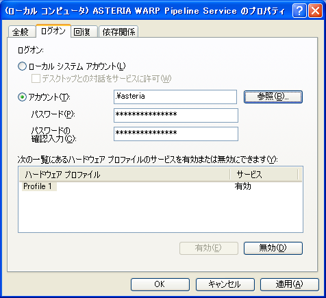 ここで、「スタートアップの種類」で「自動」を選択すると、Windows起動後に自動的にパイプラインサービスを起動します。 アクセス制御された共有フォルダにアクセスするなどWindowsアカウントでの認証が必要な場合には、下図のように明示的にアカウントの設定を行います。