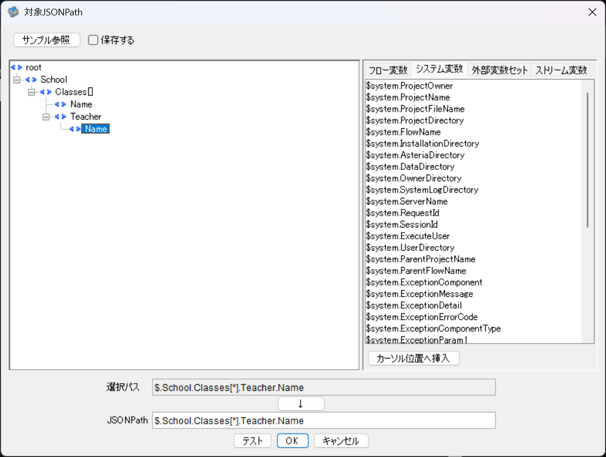 JSONPath式エディタの「カーソル位置への挿入」ボタンで変数タブで選択した変数を「JSONPath」欄のカーソル位置に追加する事が出来ます。