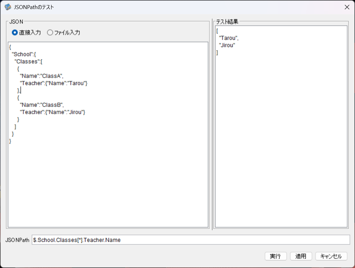 「JSONPath」欄は編集する事が出来、編集後は「適用」ボタンをクリックする事でJSONPath式エディタの「JSONPath」欄に反映する事が出来ます。